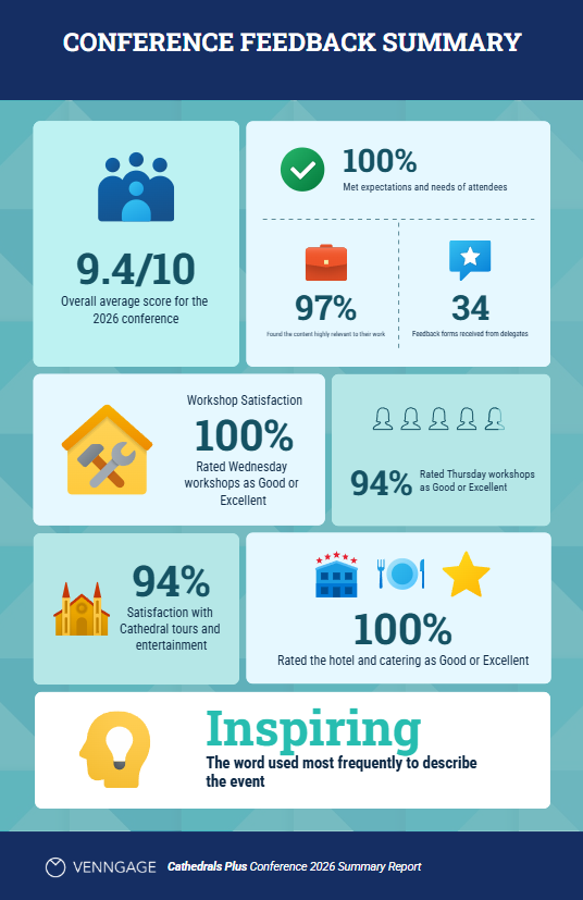 Cathedrals Plus AGM 2026. The Cathedrals Plus Council held an informal meeting over a working lunch the day prior to our AGM. All delegates attended the AGM on the last day of the conference, and the adoption of our new constitution was formally ratified. Everyone present expressed their gratitude to Jackie Holderness for her endless enthusiasm and commitment to Cathedrals Plus, as she retires from her role at the end of this year’s conference. Minutes of the AGM are available on our website here.